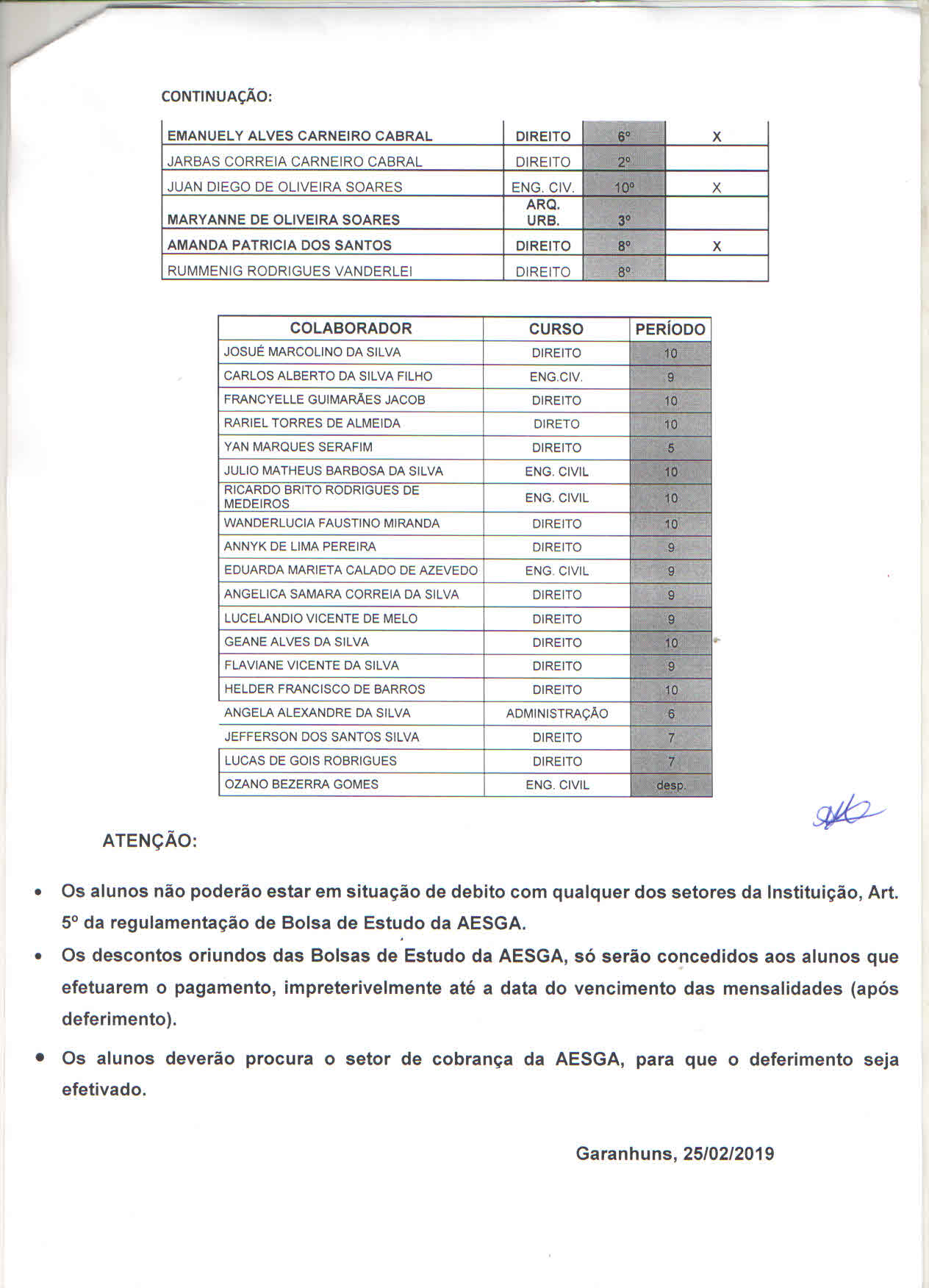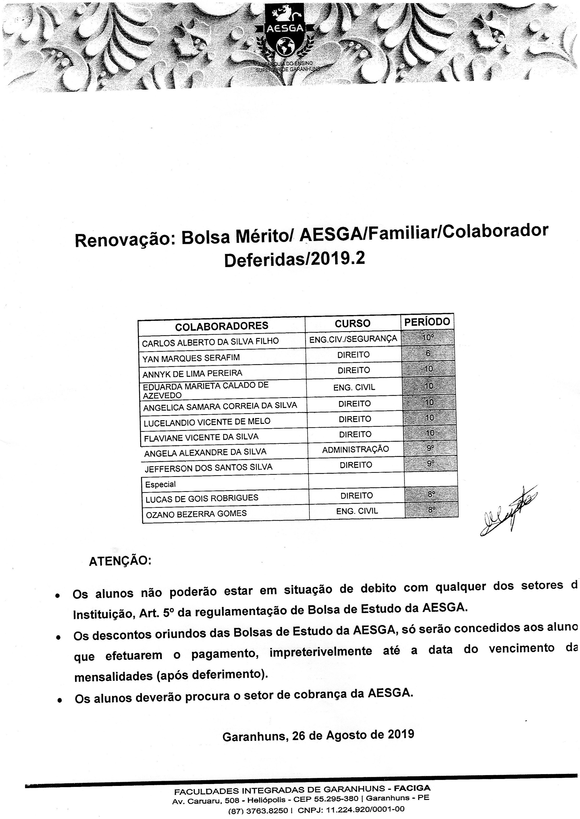 RESULTADO BOLSA DE ESTUDO AESGA, COLABORADOR E MÉRITO